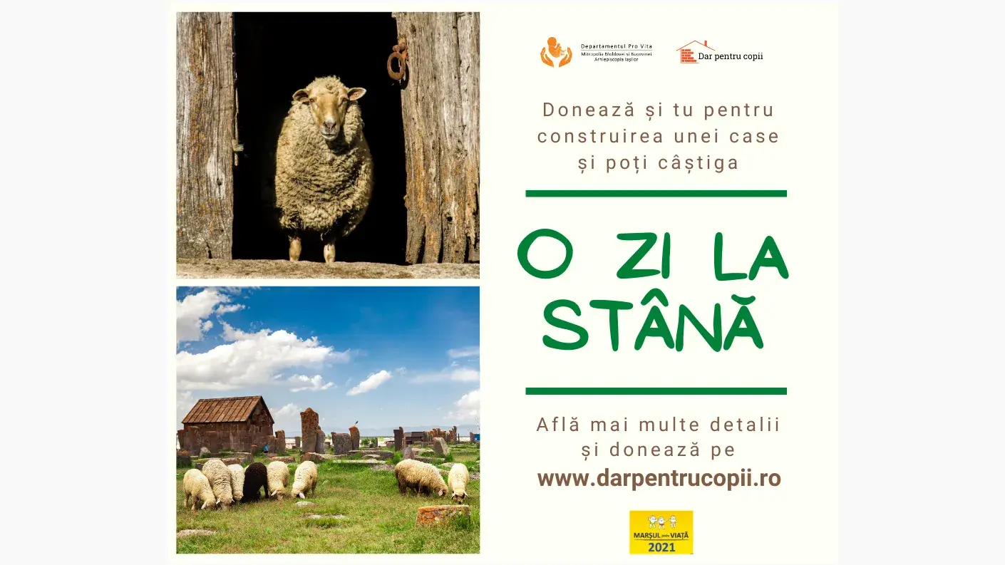 În cadrul proiectului „Dar pentru copii” Departamentul Pro Vita, din cadrul Sectorului de Misiune al Arhiepiscopiei Iașilor, organizează campania „O zi la stână”. Dintre donatorii lunii martie vor fi alese 5 persoane car vor putea să mai ia câte încă un prieten cu care să petreacă o zi în mijlocul naturii, savurând tocănița la ceaun, mămăliga, brânza extraordinară și alte mâncăruri deosebite produse la stână și bucurându-se de aerul curat.